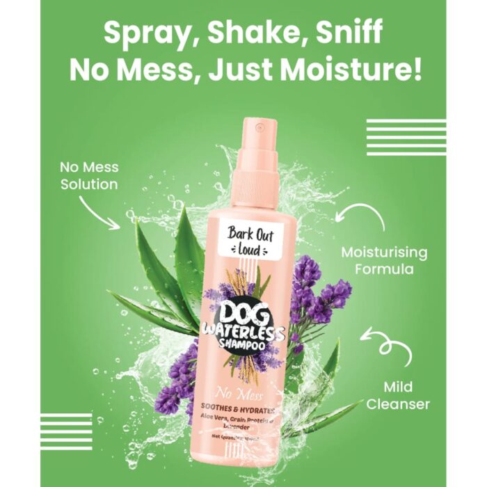 Bark Out Loud’s Dog Waterless Shampoo Spray cleanses, nourishes, and soothes your dog’s coat effortlessly. With natural ingredients like lavender flower oil, chamomile oil, aloe leaf, and wheat protein, it eliminates dirt and odors while promoting a healthy, shiny coat. Enjoy the convenience of on-the-go grooming without water or mess, perfect for busy pet parents and travel enthusiasts. Keep your furry friend looking and feeling their best, anytime, anywhere.