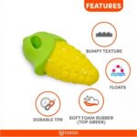 - Fofos Vegi-bites Corn is a screaming squeaker dog toy that floats in water and is great for distracting pets during bath time