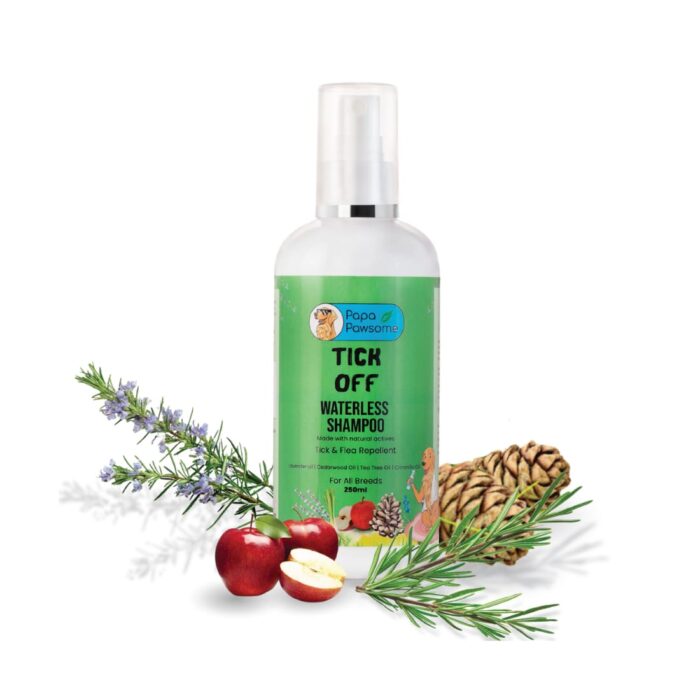 Would you believe us if we told you the answer to the perfect combination of mess-free cleansing, itch-free and tick-repelling shampoo is literally at your fingertips? Yes! Papa Pawsome’s Tick Off Waterless Shampoo, made with natural bio-actives, has your doggo’s optimal comfort in mind and provides relief against ticks and infections. Our shampoo conditions and moisturises the coat, making it healthier and preventing ticks and fleas. For best results, apply before walks on the collar, elbows and underarms before walks.