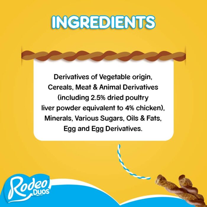 Pedigree Rodeo Duos are tasty, twisty sticks that have a deliciously chewy texture. They are full of succulent flavour, have less than 5% fat per 100 g and contains Omega 3 to help with fitness, Vitamin E to support natural defences and minerals like calcium to help strengthen bones. Pedigree Rodeo Duos are also free from artificial colours and flavours.