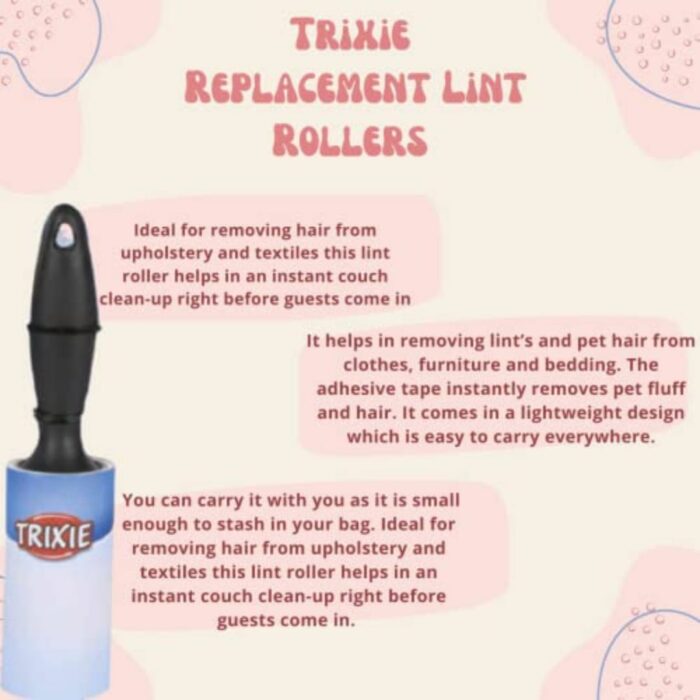 Our furry friends have more hair than us, and they tend to get it everywhere. Thankfully help is at hand with Trixie Lint Roller. The Trixie Lint Roller is the best way to clean up shed dog fur. Whether you need to clean up your Furniture or you need to remove pet hair from your clothes. All you need to do is run this lightweight and convenient roll over the surface to pick up all the hair. It can 60 disposable sheets in every roll.