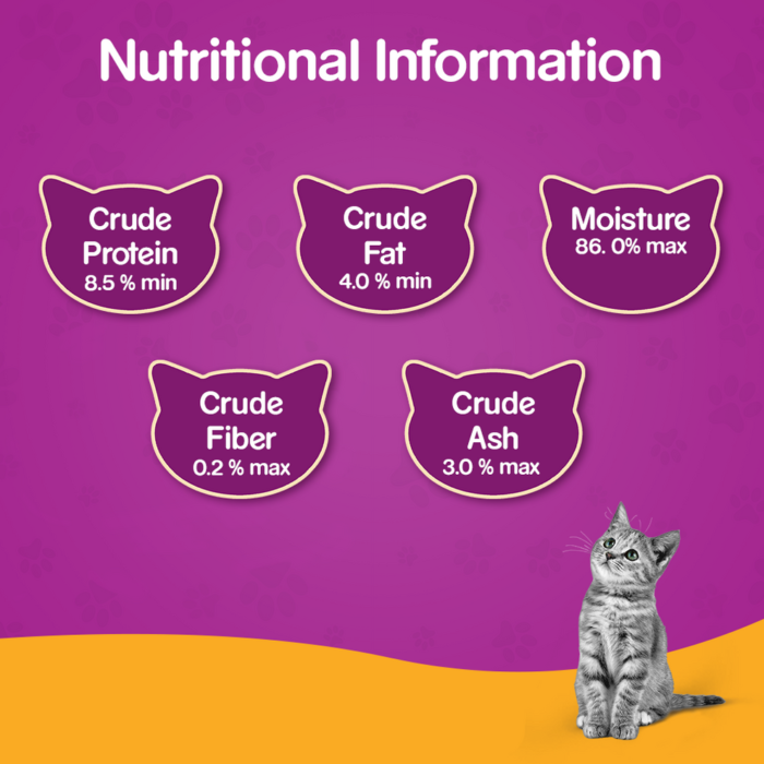 Whiskas® Tuna in Jelly is a balanced wet kitten food recipe that provides moisture and nourishment for a healthy, active growing kitten that requires specific care and nutrition. A kitten’s love for fish is blended with loads of calcium, phosphorus, proteins, antioxidants, vitamins & minerals, to maintain its fur, heart-health, weight, skin, teeth, muscles, bones and overall immunity. Wet kitten food appeals to the palate of fussy eaters and gives them the delight of relishing a juicy, wholesome meal while strengthening them from the inside.